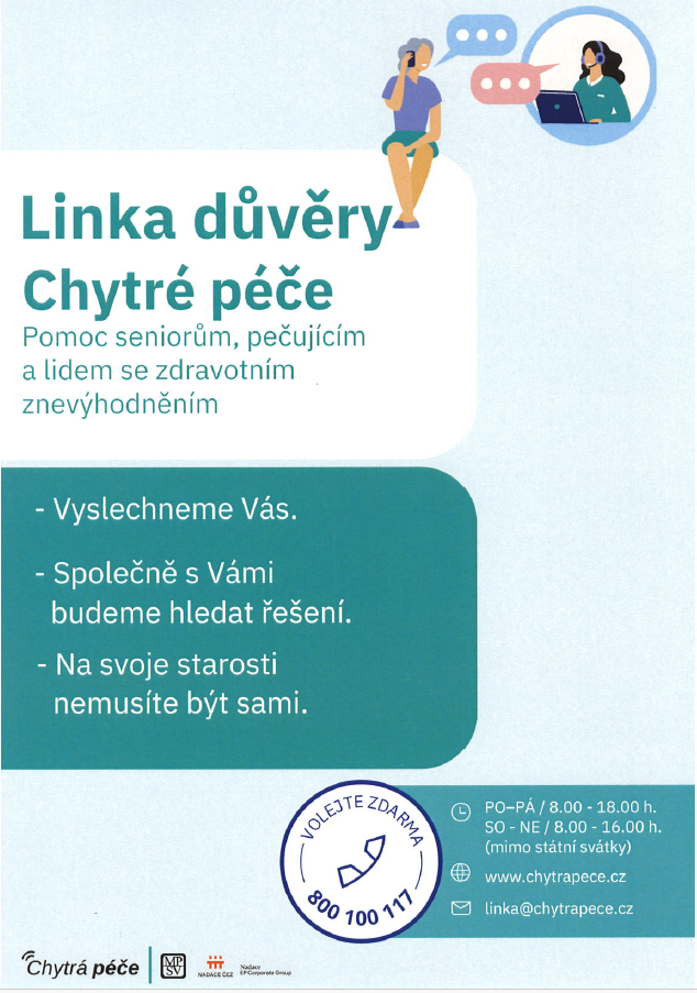 Celostátní bezplatná linka krizové pomoci Chytré péče 800 100 117 je registrovaná sociální služba, která poskytuje telefonickou podporu a pomoc seniorům, pečujícím a osobám se zdravotním postižením, kteří se ocitli v náročné životní situaci.
