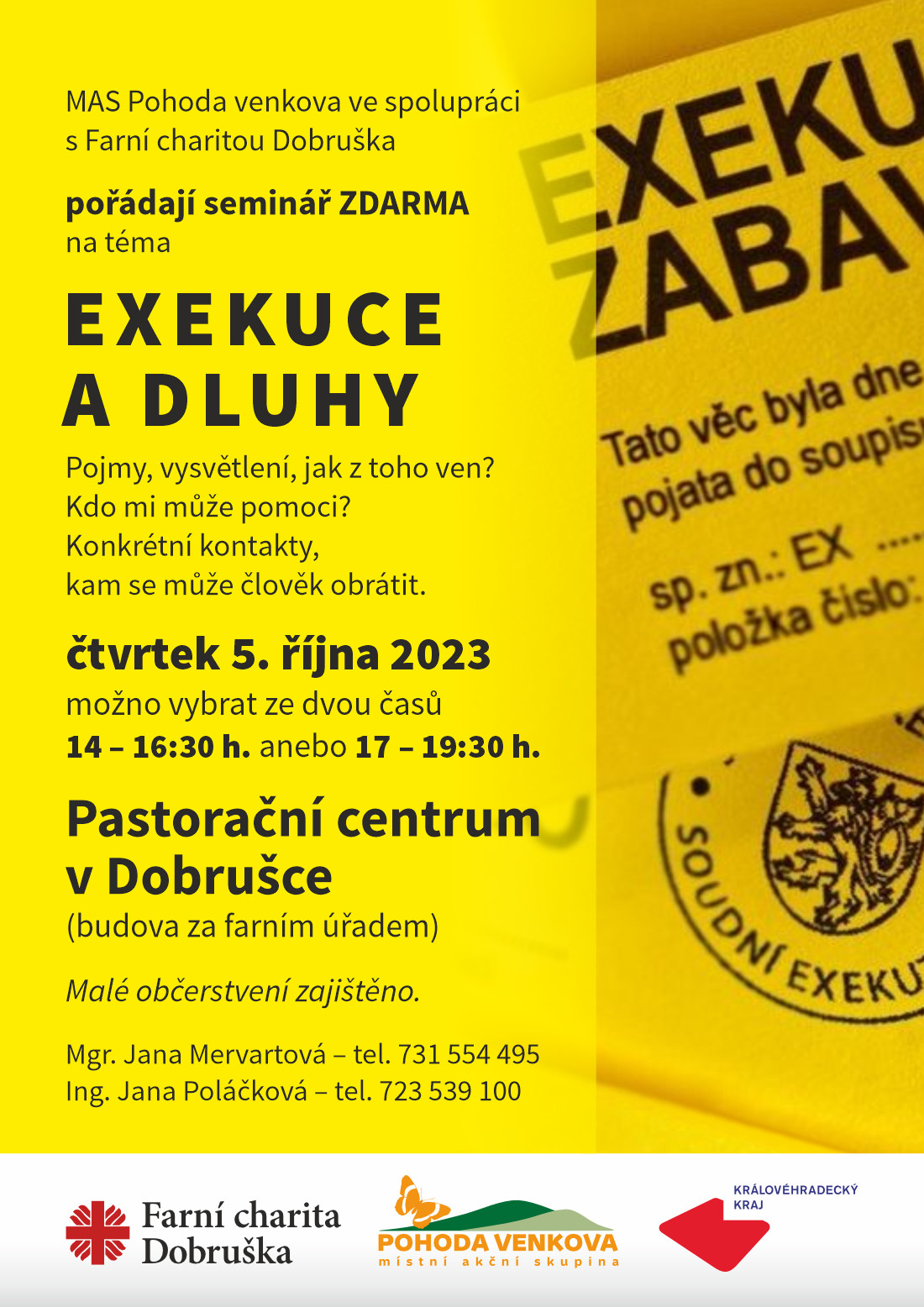 MAS Pohoda venkova ve spolupráci s Farní charitou Dobruška pořádají ZDARMA seminář na téma Exekuce a dluhy. Tento seminář se koná ve čtvrtek 05. října 2023 od 14-16:30 hodin nebo od 17 - 19:30 hodin v Pastoračním centru v Dobrušce (budova za farním úřadem).