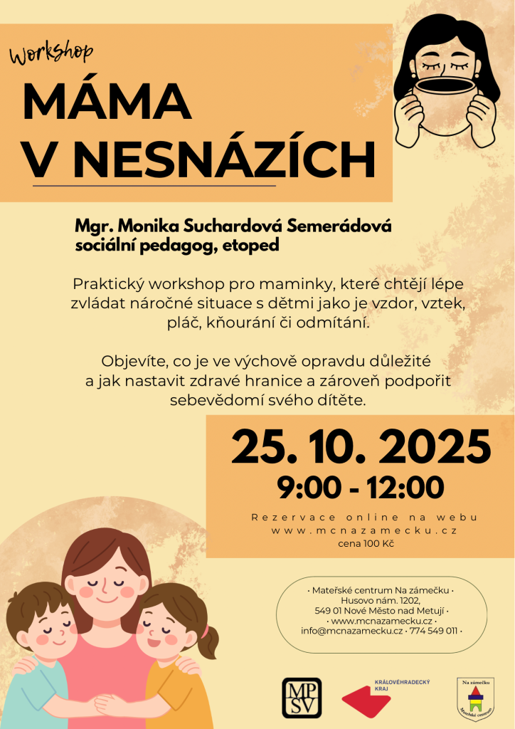 Mateřské centrum Na zámečku Vás zve na workshop nazvaný "Máma v nesnázích", který se koná dne 25.10.2025 od 9:00-12:00 hodin.