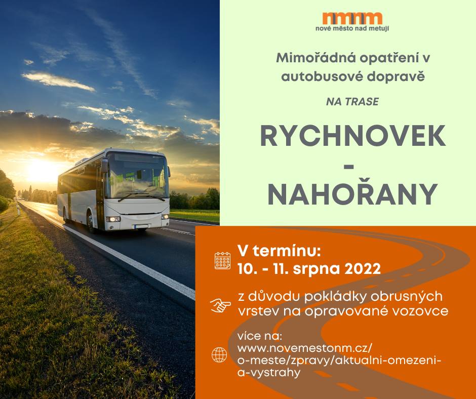 Z důvodu pokládky obrusných vrstev vozovky na uzavírce Rychnovek – Nahořany dojde ve dnech 10.srpna a 11.srpna 2022 k mimořádným dopravním opatřením v autobusové dopravě.