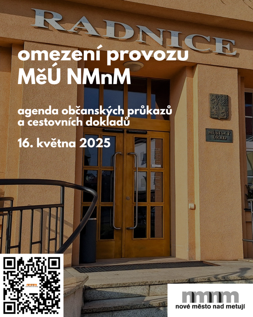 Informujeme občany, že z důvodu školení bude v pátek 16. května 2025 uzavřena agenda občanských průkazů a cestovních dokladů. Děkujeme za pochopení.