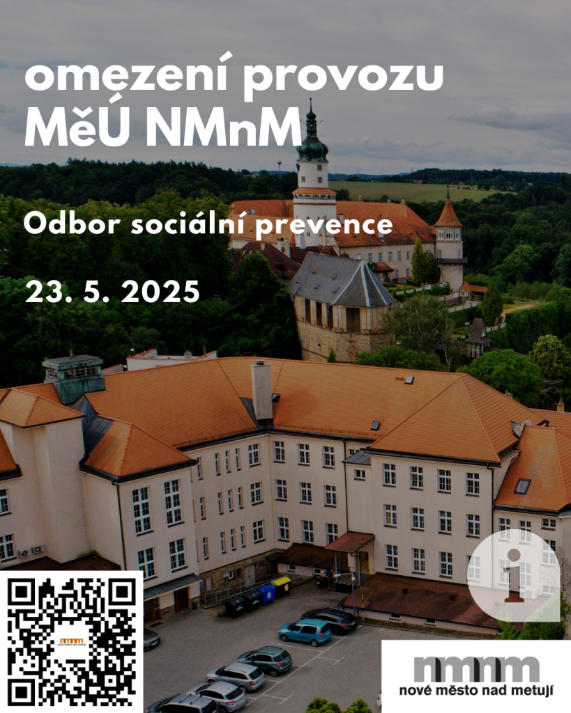Informujeme občany, že v pátek 23. května 2025 bude v čase od 08:00 do 14:00 hodin uzavřeno pracoviště Odboru sociální prevence z důvodu vzdělávání.