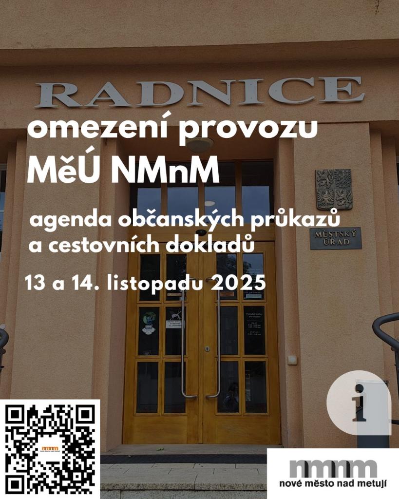 Upozorňujeme občany, že z důvodu školení budou dne 13. a 14. listopadu 2025 uzavřeny agendy občanských průkazů a cestovních dokladů.