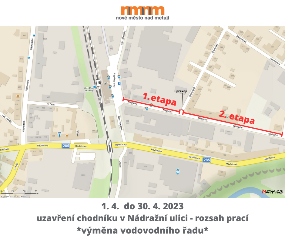 Od 1. do 30. dubna 2023 bude v ulici Nádražní probíhat výměna vodovodního řadu ve vyznačeném úseku. Práce budou probíhat ještě před plánovanou rekonstrukcí chodníků v tomto úseku ulice. Chodník bude po té uveden do provizorního stavu umožňujícího pohyb chodců a finální úprava bude provedena při realizaci stavby chodníků.