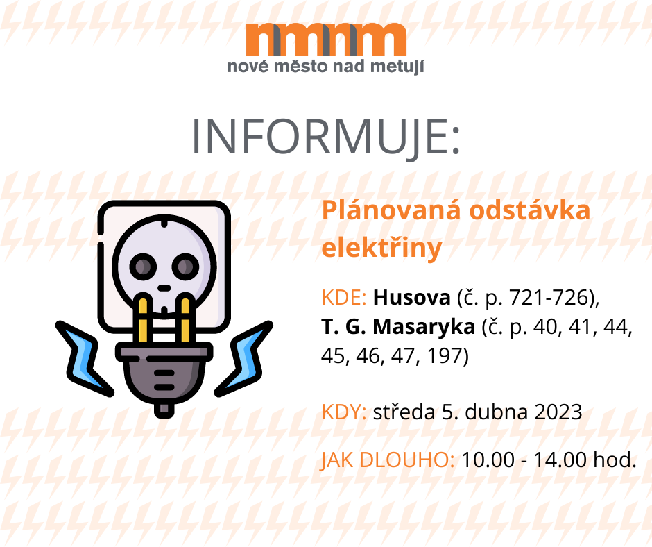 Informujeme o plánované odstávce elektřiny, která v našem městě proběhne v středa 5. dubna 2023 od 10.00 do 14.00 hod.: