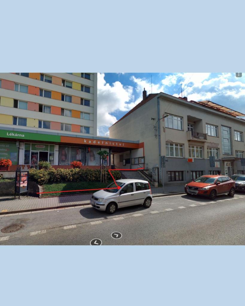 Trasa překopu vede od zálivu u chodníku k obvodové stěně polikliniky, jak je zhruba vyznačeno na fotografii.