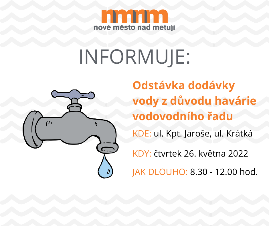 Z důvodu havárie na vodovodním řadu bude ve čtvrtek, 26. května 2022, od 8.30 hod. - 12.00 hod., přerušena dodávka vody v ul. Kpt. Jaroše a ul. Krátká.