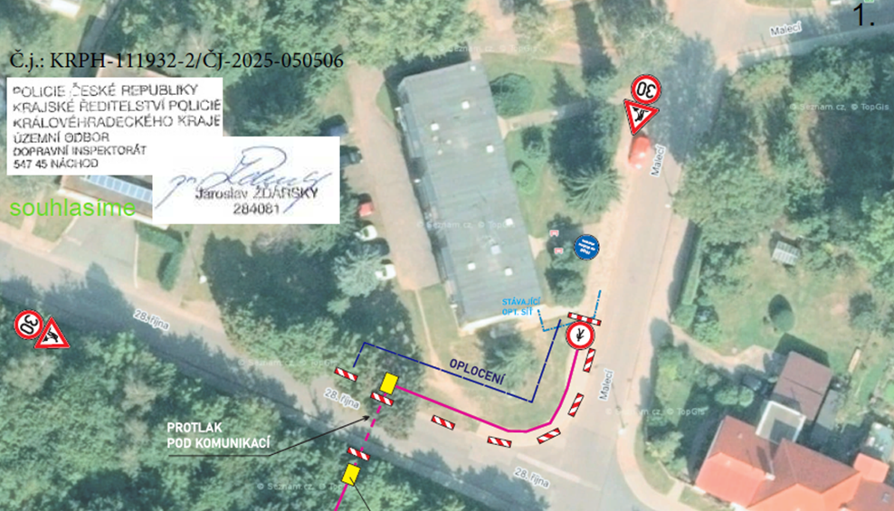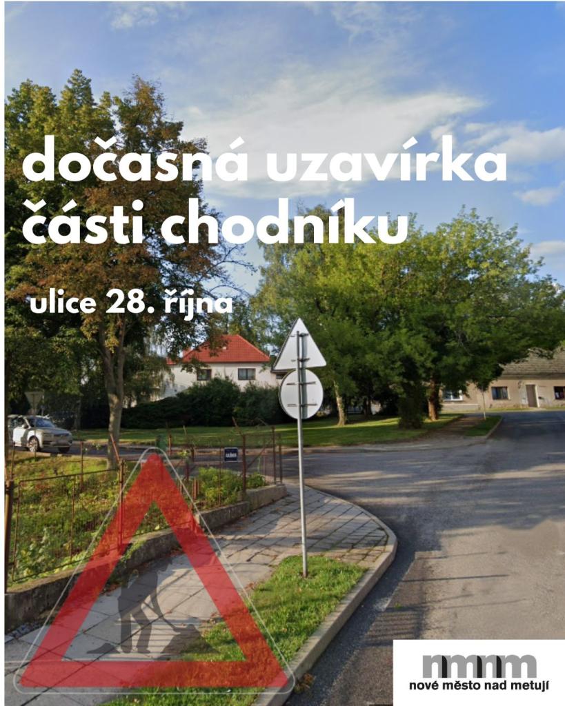 Informujeme občany o dočasném záboru části chodníku v ul. 28.října na pozemku p.p.č.619/16, p.p.č. 2064/2, k.ú. Nové Město nad Metují z důvodu provádění výkopových prací pro uložení optické sítě.