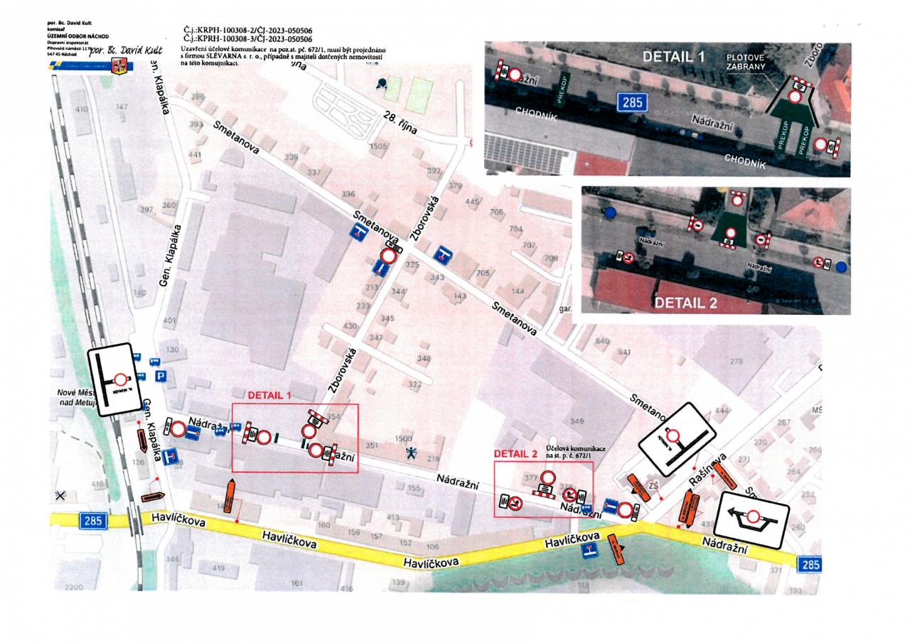 Z důvodu opravy povrchu po provedených výkopech dojde v termínu od 9. 10. 2023 do 14. 10. 2023 k uzavírce ulic Nádražní, Gen. Klapálka, Zborovská, Smetanova a Rašínova a také účelové komunikace na p. p. č. 672/1 (příjezdová komunikace do Slévárny s.r.o.).
