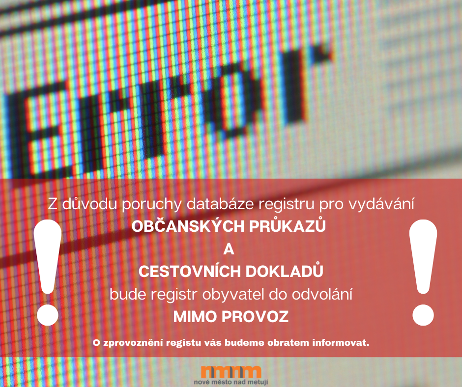 Z důvodu poruchy databáze registru pro vydávání občanských průkazů a cestovních dokladů bude registr obyvatel do odvolání MIMO PROVOZ .