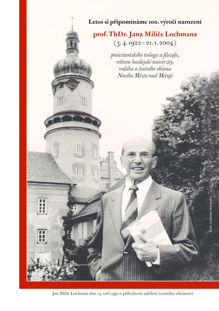 Minulý víkend v neděli uběhlo právě 100 let od narození prof. ThDr. Jana Miliče Lochmana, mult. Dr.h.c., DD – protestantského teologa a filosofa, rektora basilejské univerzity, rodáka a čestného občana Nového Města nad Metují. U této příležitosti se v Husově sboru konalo setkání, na kterém na Lochmanův odkaz zavzpomínala nejen rodina ale také představitelé Církve československé husitské i Církve bratrské a zástupci akademické půdy v oboru teologie. Projekt pamětní desky Jana Miliče Lochmana představil akademický sochař mistr Petr Novák. Přítomné v Novém Městě nad Metují přivítal také starosta města pan Petr Hable. Příjemné odpolední setkání hrou na housle, violoncello a varhany doplnili Terézie Lichá a Petr Lichý.