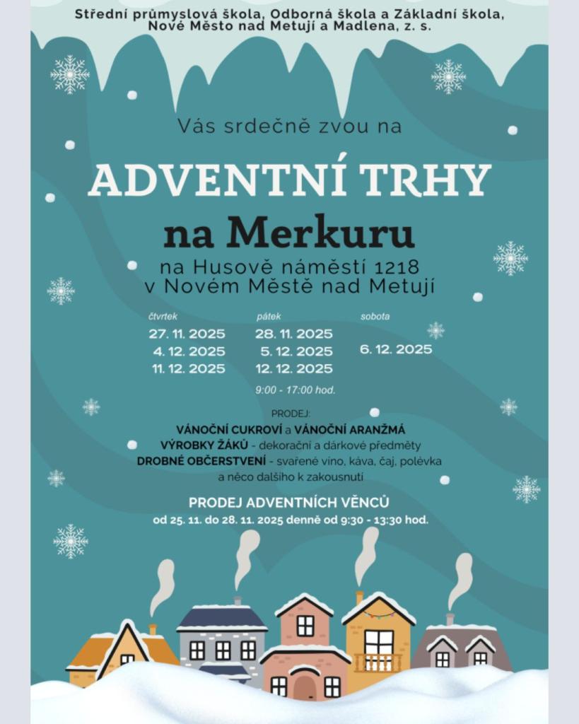- 27.–28.11., 4.–6.12., 11.–12.12.: Adventní trhy na Merkuru (Husovo náměstí, 9:00–17:00)
