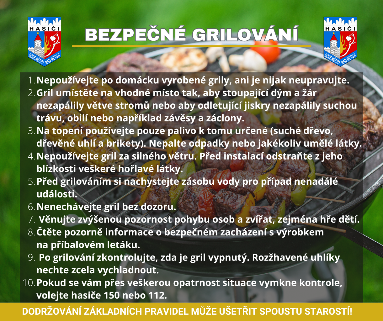 krásné počasí přímo vybízí sejít se s přáteli či s rodinou na zahradě a užít si hezký večer plný pohody a zábavy, při kterém si ogrilujeme něco dobrého na zub. Při grilování pracujeme s otevřeným ohněm, proto je důležité dodržovat pár základních bezpečnostních pravidel, aby společný čas neskončil zbytečnými starostmi. Přejeme klidné dny.