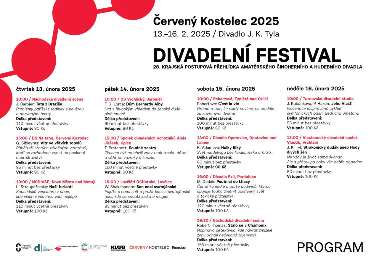 Krajská postupová přehlídka amatérského činoherního a hudebního divadla míří do Červeného Kostelce. Její 28. ročník proběhne od 13. do 16. února 2025 v Divadle J. K. Tyla. I letos představí to nejlepší z Královéhradeckého a Pardubického kraje. Dramaturgové zvou diváky na TOP 12 inscenací. Ty nejlepší, které osloví porotu, pak získají nominaci na celostátní přehlídku Divadelní piknik v Mostě.