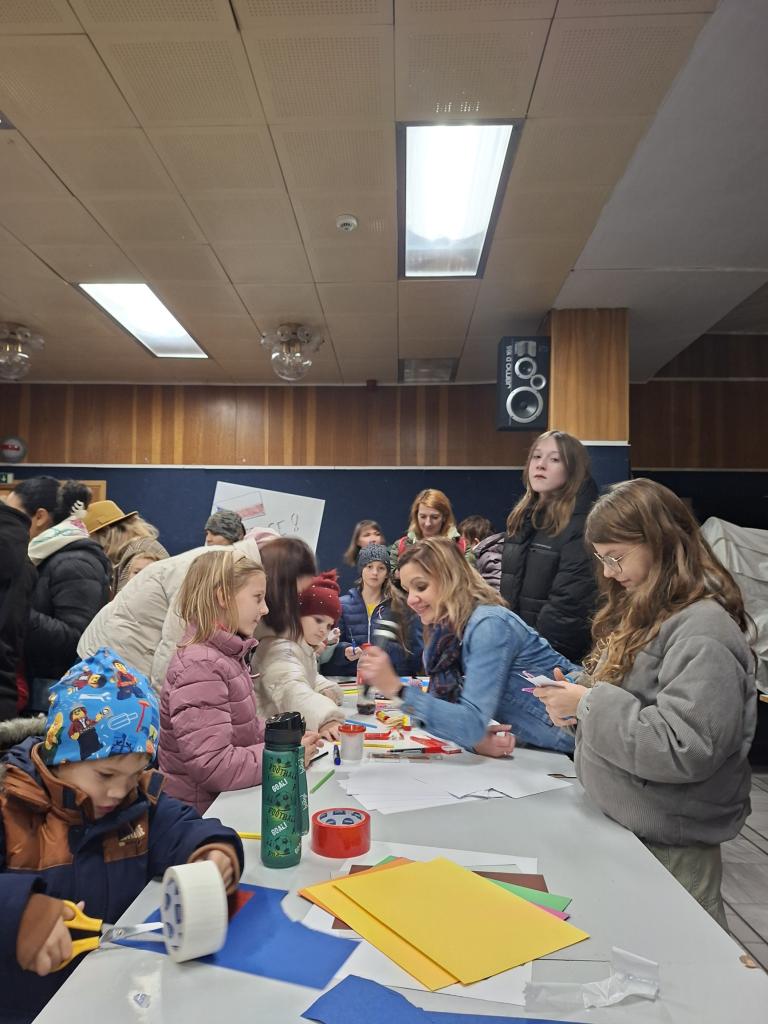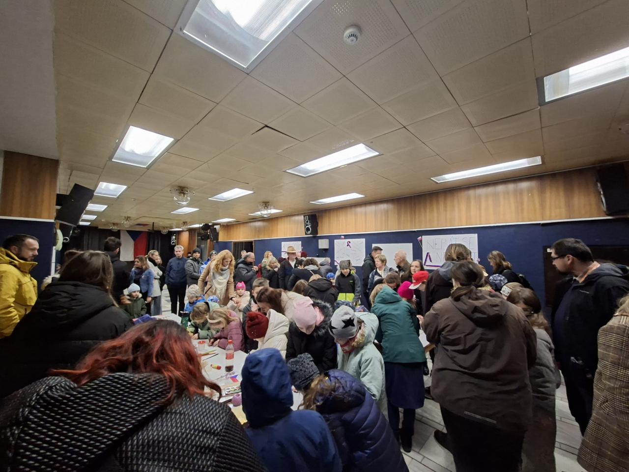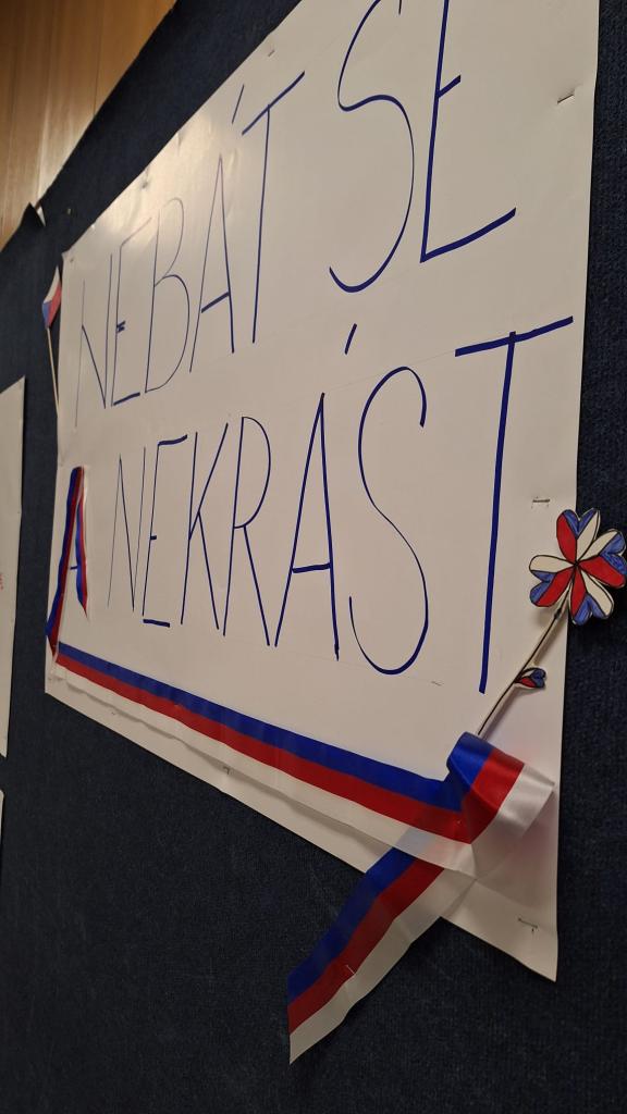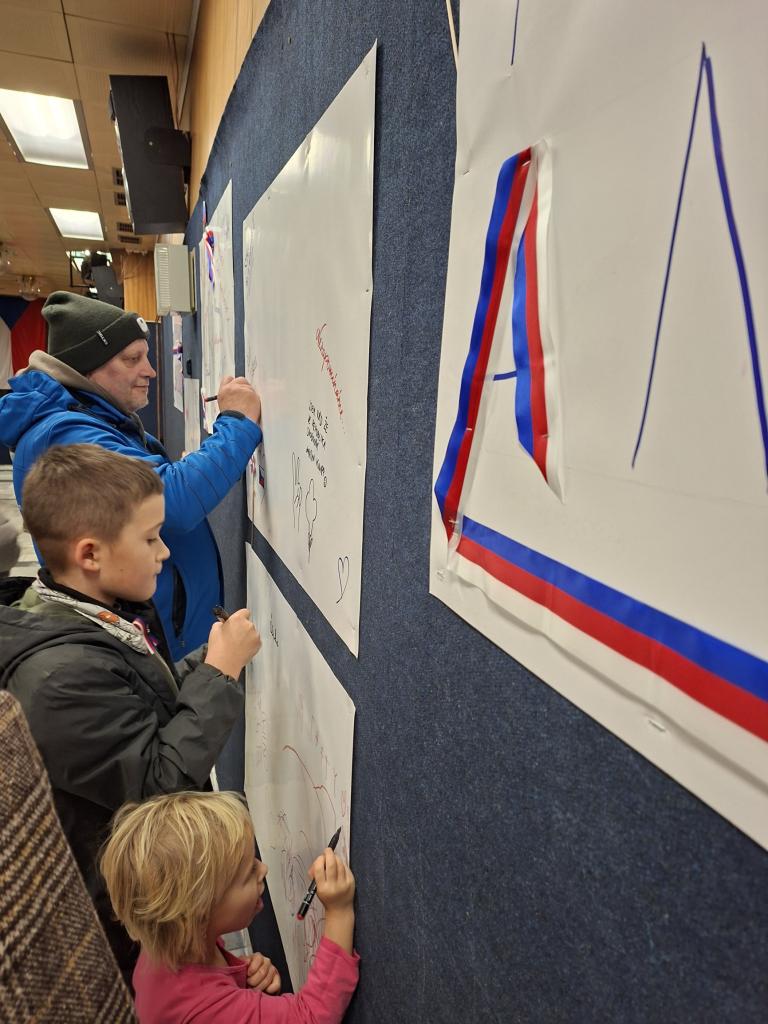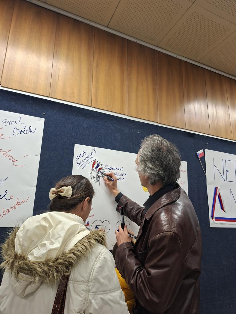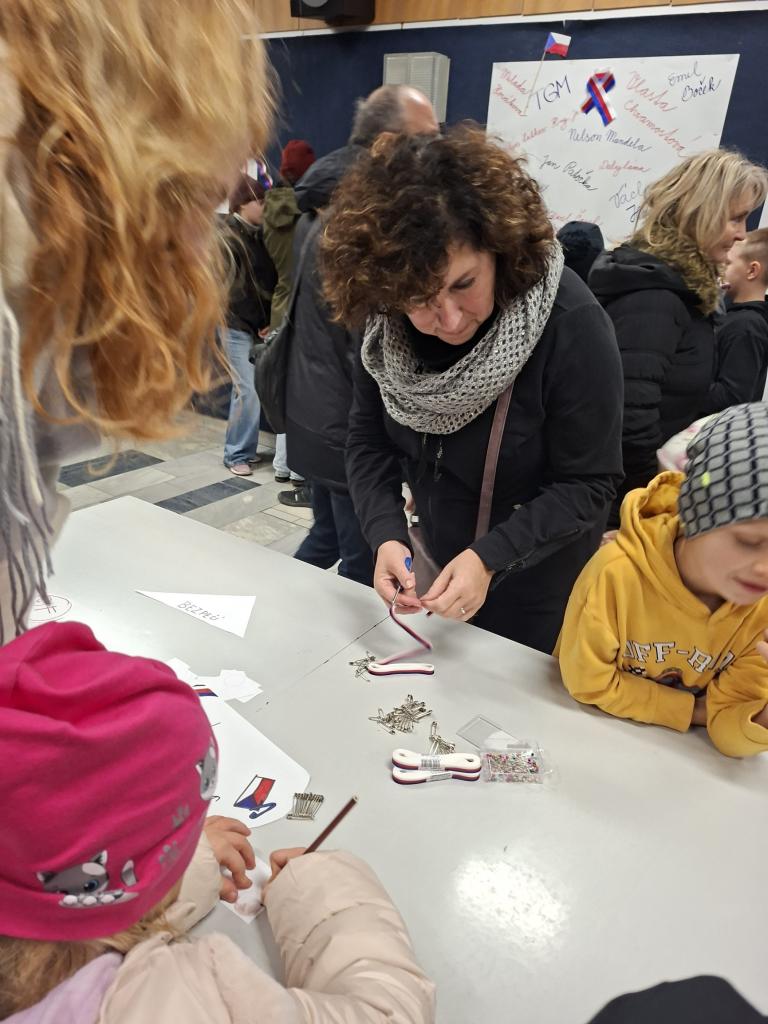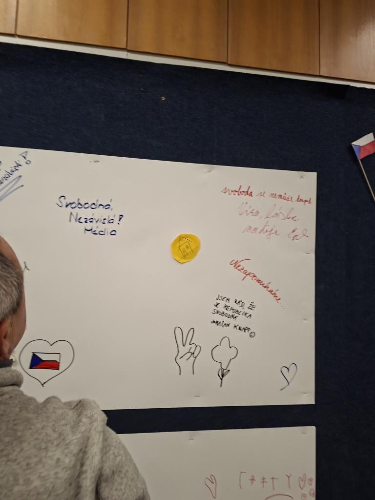 Po oficiální části, kdy promluvil pan starosta a zazněly zpěvy a státní hymna v podání dětského pěveckého sboru Prostředníček ZUŠ B. Smetany, bylo skvělé sledovat, jak se návštěvníci zapojili do společné tvorby koláže, potkávali se a debatovali v přátelské atmosféře. Program pokračoval projekcí dokumentu Čtyři příběhy revoluce.