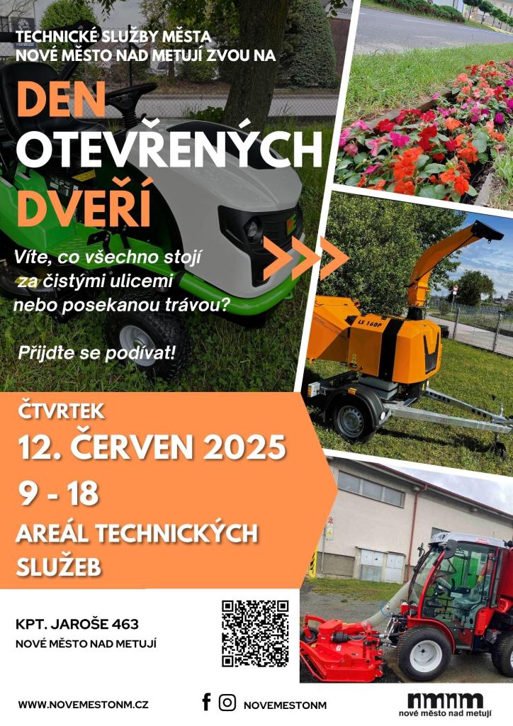 Ve čtvrtek 12. června 2025 se pro vás v čase 9:00–18:00 otevře areál technických služeb na adrese Kpt. Jaroše 463. Těšit se můžete na ukázky techniky, která pomáhá v létě udržovat naše město čisté a upravené, prohlédnout si budete moci také zázemí a prostory areálu Technických služeb.