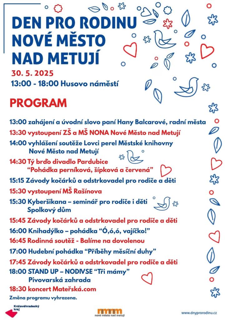 V pátek 30. května 2025 vás zveme na Husovo náměstí, kde se odehraje odpoledne plné zábavy i užitečných informací pro malé i velké - Den pro rodinu Nové Město nad Metují.