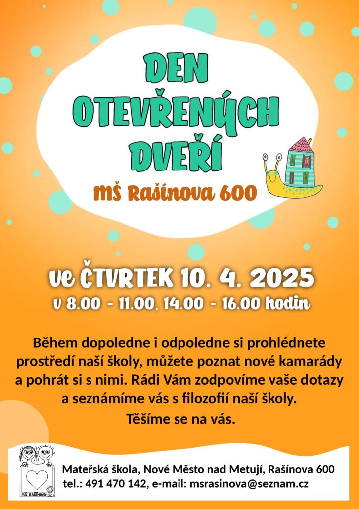 - Mateřská škola Rašínova 600 - čtvrtek 10. dubna 2025 od 8 – 11 a 14 – 16 hodin