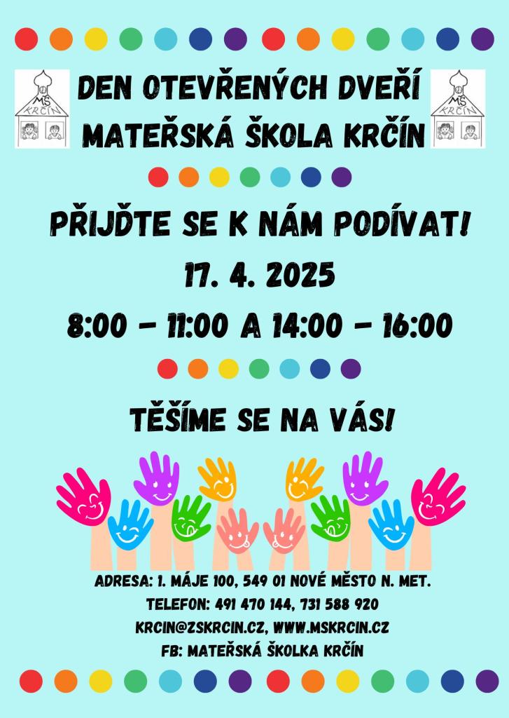 - Mateřská škola Krčín – čtvrtek 17. dubna 2025 (ZŠ a MŠ Krčín) od 8 – 11 a 14 – 16 hodin