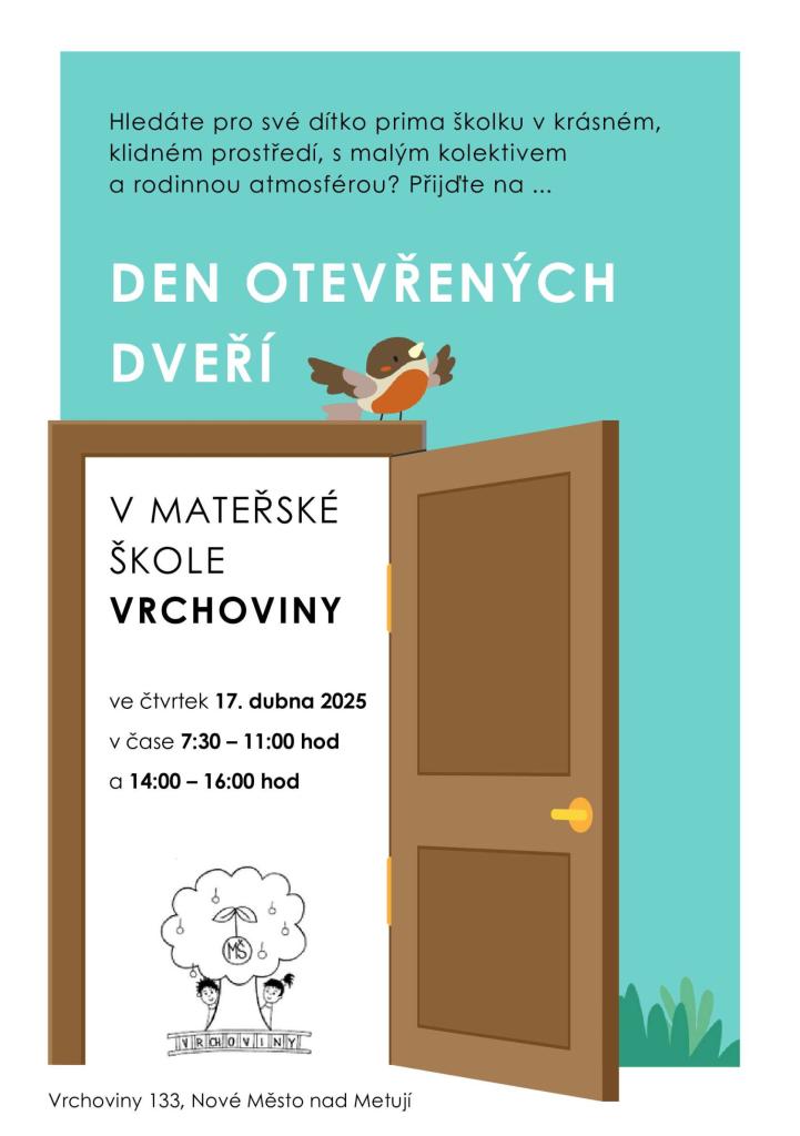 - Mateřská škola Vrchoviny - čtvrtek 17. dubna 2025 (Odloučené pracoviště ZŠ a MŠ Krčín) od 8 – 11 a 14 – 16 hodin