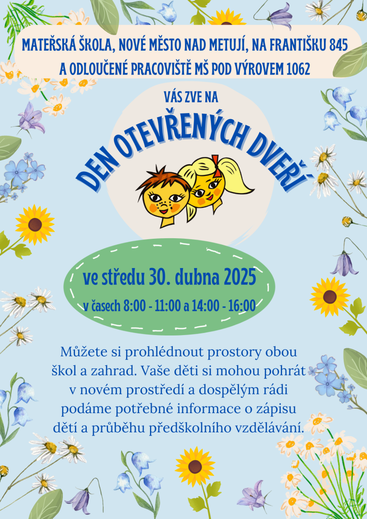 Zveme všechny zájemce na Dny otevřených dveří novoměstských mateřských škol. Můžete si prohlédnout jednotlivé mateřské školy a zahrady. Vaše děti si mohou pohrát a dospělým rádi podáme potřebné informace o zápisu dětí a průběhu předškolního vzdělávání.
