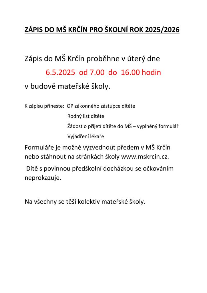 - V mateřské škole Krčín a Vrchoviny bude zápis v úterý 6. května 2025 od 7 do 16 hodin.