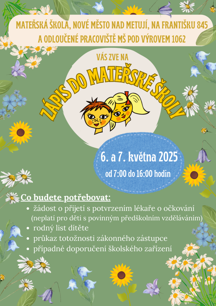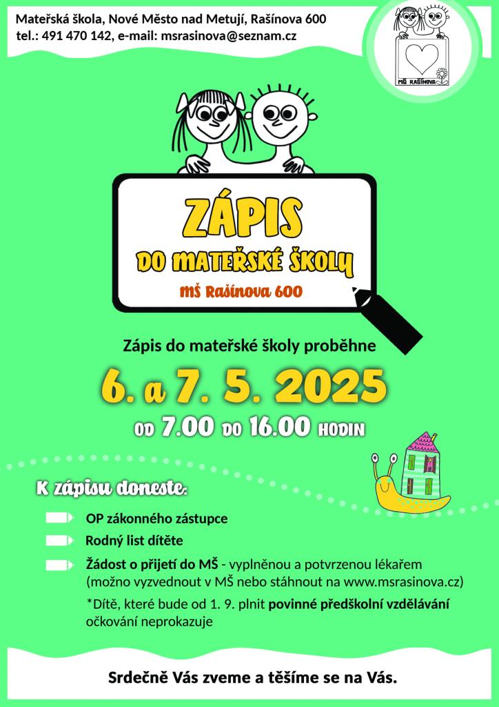 - Zápis do mateřské školy Na Františku 845 a Rašínova 600 bude v úterý 6. a středu 7. května 2025 od 7 do 16 hodin.