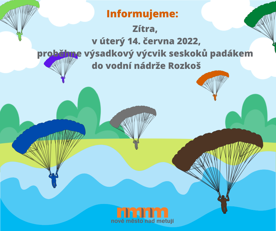 Zítra - v úterý 14. černa 2022, bude v průběhu celého dne probíhat výsadkový výcvik seskoků padákem do vodní nádrže Rozkoš.