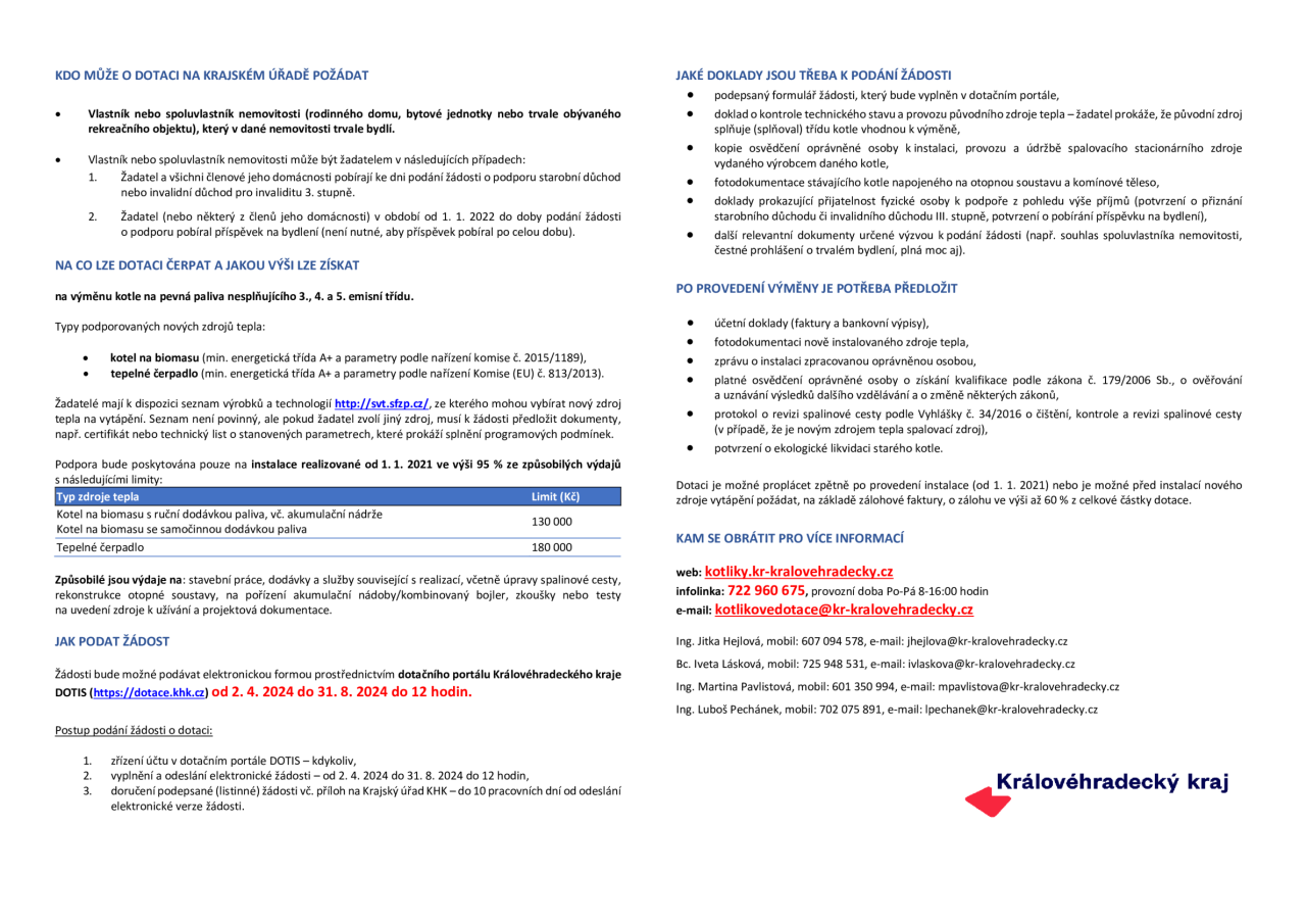 Veškeré dostupné informace lze získat také na infolince 722 960 675 v pracovní dny od 8 do 16 hodin nebo na e-mailu: kotlikovedotace@kr-kralovehradecky.cz.