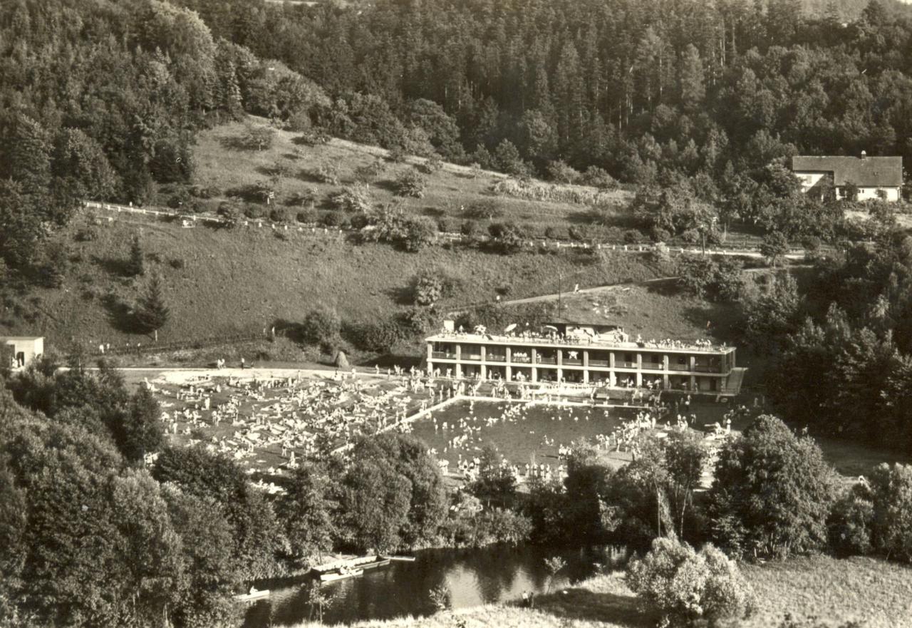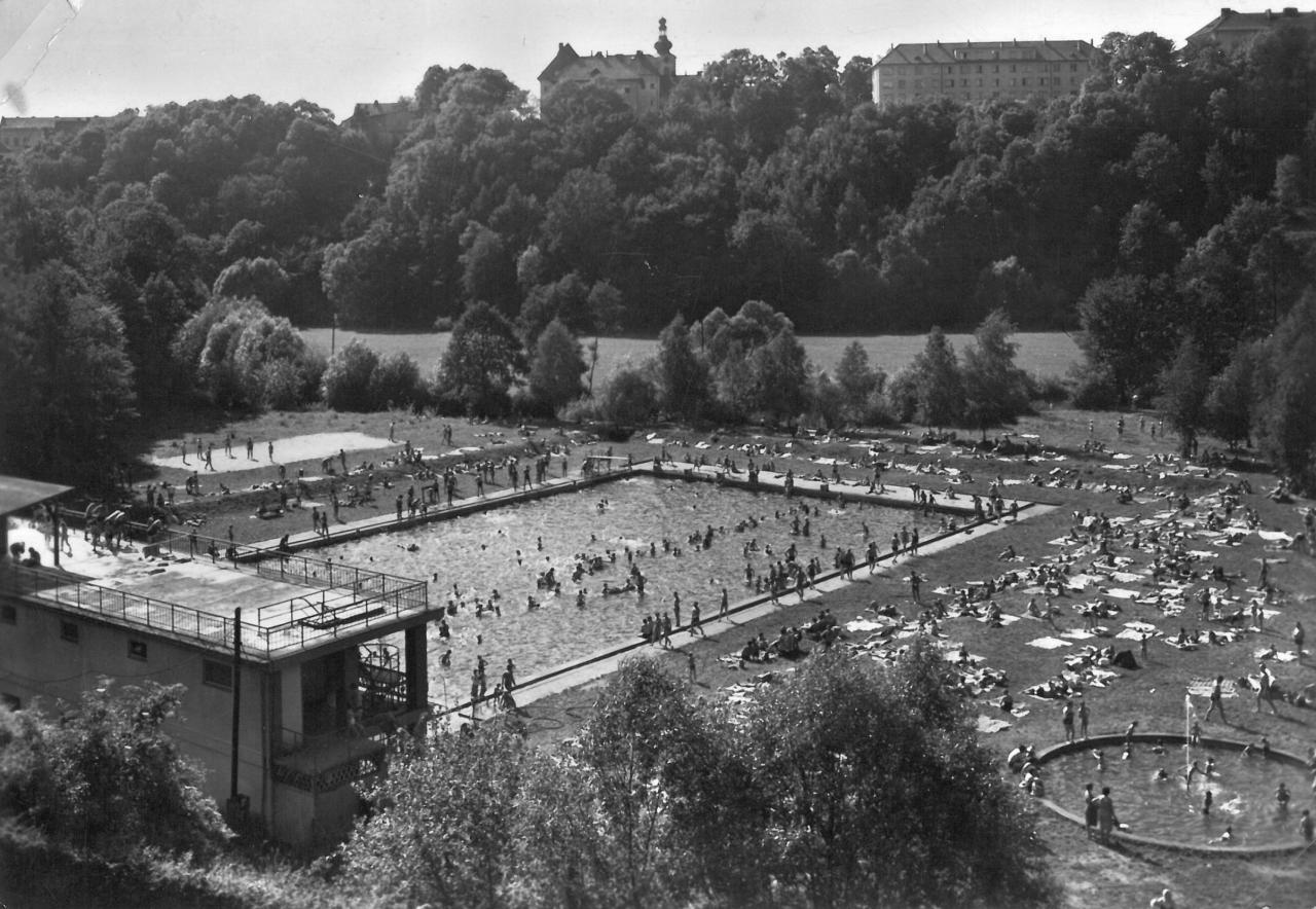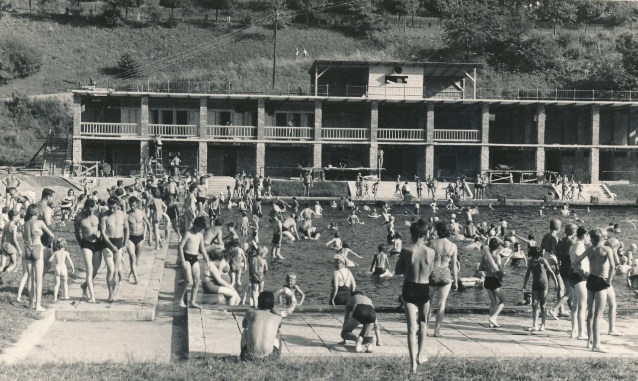 V polovině 50. let se koupaliště konečně otevřelo. Dostalo prostorný betonový bazén, kruhové brouzdaliště s teplou vodou, dvoupatrové kabiny, sluneční terasu i bufet, kde se v neděli podávaly teplé obědy. Děti milovaly vodotrysk, který zároveň dokázal potrápit plavčíky – když malí šikulové zakryli otvor trysky, přetěžoval se motor na druhém břehu a vypadávaly pojistky.