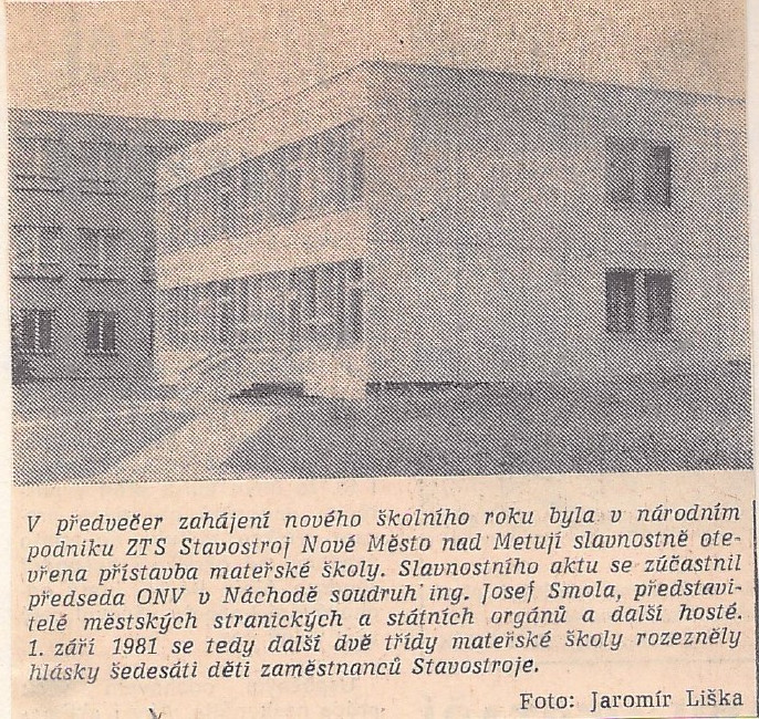 „Závodní mateřská škola byla postavena nákladem 1 236 000 Kč. Tato částka byla poskytnuta krajskou odborovou radou v Hradci Králové“ Nechybí ani zmínka o nákladech na vnitřní vybavení školy 300 000 Kčs, které hradil národní podnik Stavostroj. Projekt školy potom stál 25 000 Kč. Čtyřpodlažní budova (jedno podlaží je podzemní) byla vystavěna z voštinových cihel. Zastavěná plocha tehdy činila 344 m2 na celkové výměře školního pozemku 5 644 m2. Ve školce byly 4 třídy s kapacitou 100 dětí. Aby bylo prostředí školy pro děti příjemné byly dokonce do provozních místností zakoupeny květiny v hodnotě 6 000 Kčs a některé, vzácné druhy, byly přivezeny až z Olomouce. Dětem bylo zároveň pořízeno ústavní oblečení. Mateřskou školy si jezdily prohlížet delegace nejen z kraje a České republiky, ale navštívilo ji i několik delegací z Evropy – z Belgie, Polska, SSR, Maďarska, Německé spolkové republiky i Německé demokratické republiky, ale také například výprava lékařů z Francie a delegace učitelek z Holandska.