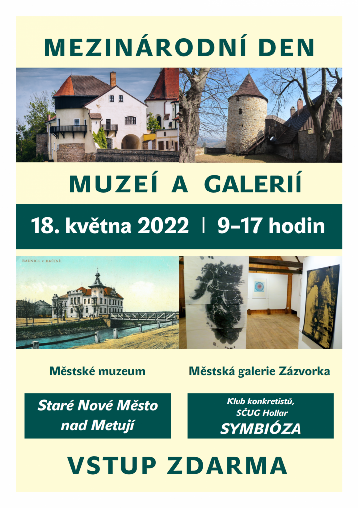 Městské muzeum Nové Město nad Metují a Městská galerie Zázvorka vás ve středu 18. května 2022 v rámci Mezinárodního dne muzeí a galerií zvou na aktuální výstavy - Staré Nové Město nad Metují (výstava pohlednic a fotografií pana Josefa Martinka) a výstavu Klubu konkretistů a SČUG Hollar SYMBIÓZA.