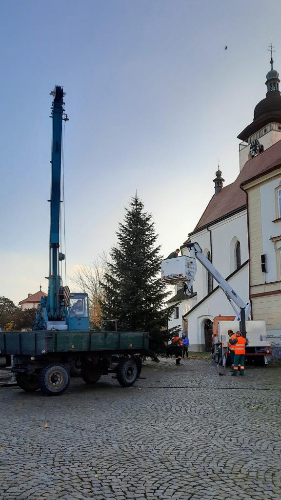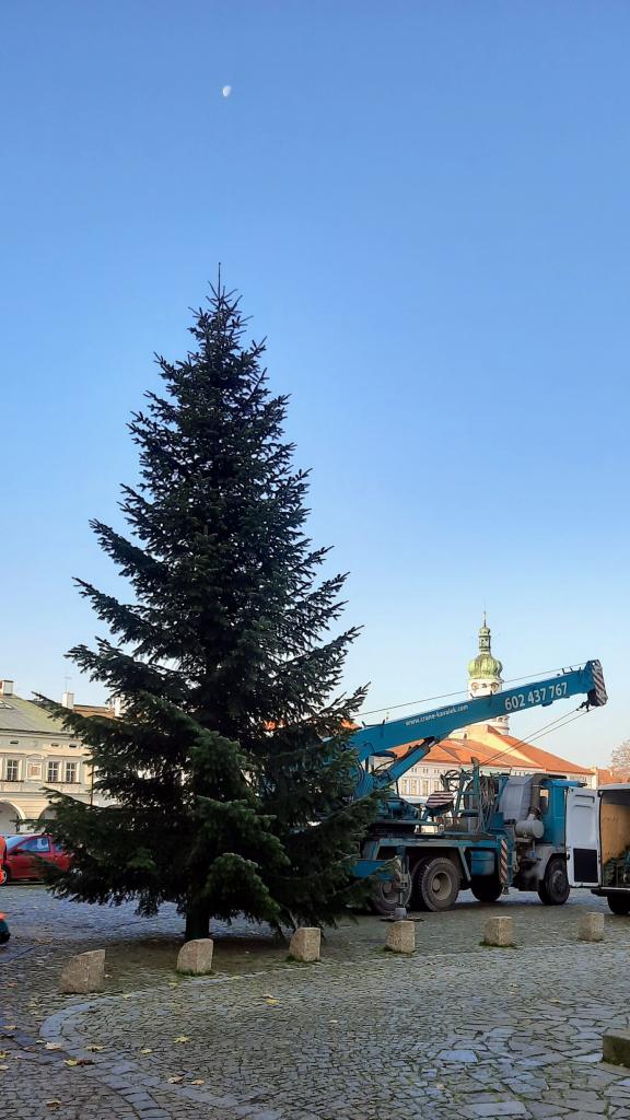 Dnes brzy ráno Technické služby města vyrazily na Mezilesí, aby zde pokácely vánoční strom, který pro letošní adventní čas věnovali Novému Městu nad Metují Machovi. Asi 9 metrů vysoká jedle byla za pomocí jeřábu ještě před devátou hodinou ranní usazena do zabudovaného stojanu na Husově náměstí před kostelem Nejsvětější Trojice.