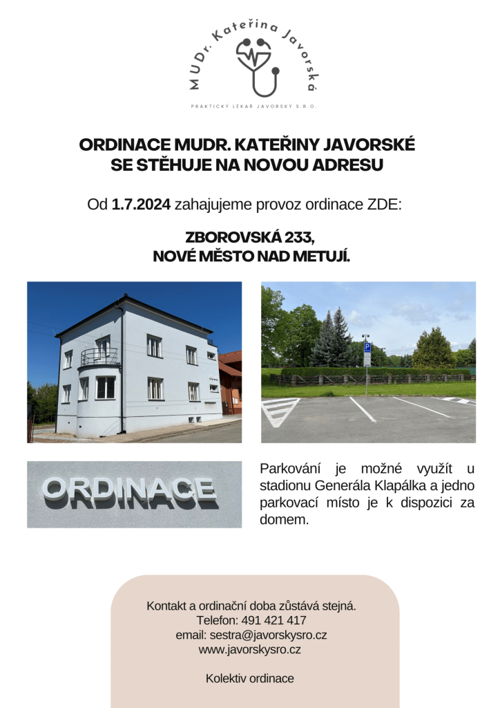 Ordinace MUDr. Kateřiny Javorské se stěhuje na novou adresu. Od 1. července 2024 zahajujeme provoz ordinace nově na adrese: Zborovská 233, Nové Město nad Metují. Parkování je možné využít u Stadionu Generála Klapálka a jedno parkovací místo je k dispozici za domem. Kontakt a ordinační doba zůstává stejná.
