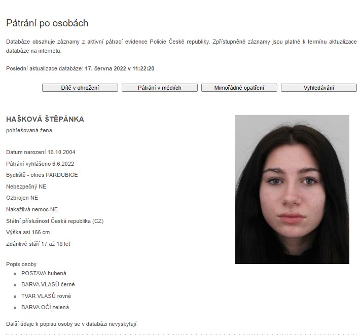 Obrátila se na nás s žádostí o pomoc maminka 17leté Štěpánky Haškové z Pardubic, která je pohřešována od 6. června 2022. Údajně mohla s kamarádem odjet do Nového Města nad Metují, své rodině už se ale bohužel od té doby neozvala.