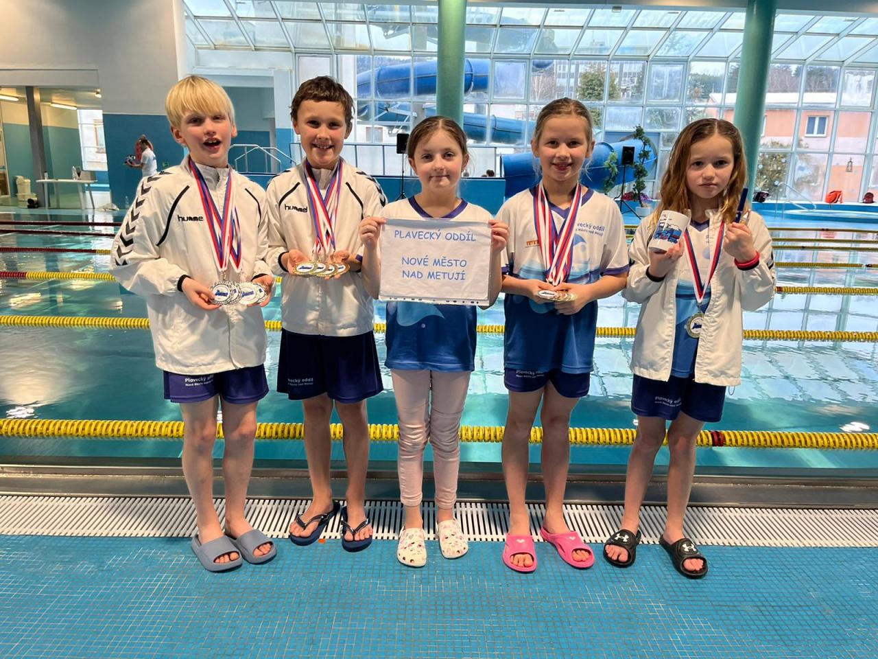 My jsme zde letos již měli plavce o něco zkušenější, kteří tu nezávodili poprvé. Náš oddíl reprezentovali Adélka Buriánková, Anička Černá, Tom Prislinger, Viktor Zicha a Kája Židíková. Závody probíhaly celý den, který byl rozdělený na dopolední a odpolední program. Každý ze závodníků mohl nastoupit na dva starty za půl den. Všichni soupeřili ve všech čtyřech stylech: znak, prsa, motýlek a volný způsob. Anička s Adélkou zde závodily již v 50 m tratích. Tom, Viky a Kája mohli ještě startovat v tratích na 25 m. Hodnocení probíhalo po jednotlivých ročnících: 2012, 2013, 2014 a 2015 a mladší. Novoměstští plavci ovládli všechny tratě na 25 m. Na bednách byli ve všech startech. Kája Židíková si vybojovala 3x zlatou a 1 stříbrnou medaili. Viktor Zicha a Tom Prislinger byli při vyhlašování vedle sebe pokaždé na nejvyšších postech. Tom získal 4 zlaté medaile, Viky 4 stříbrné. Anička sA délkou to měly o něco těžší na delších tratích, ale obě se popraly o pěkná umístění Anička (1 zlatá medaile, 2x 5.místo, 7.místo) a Adélka (7., 9., 10., 12. místo)