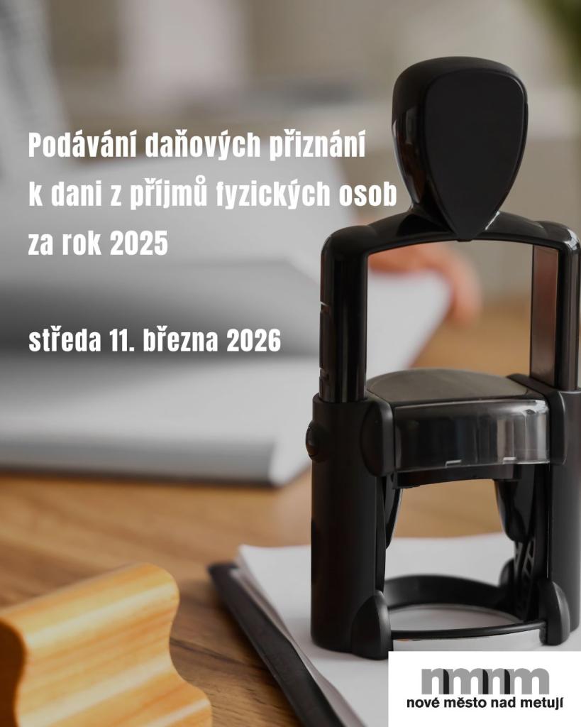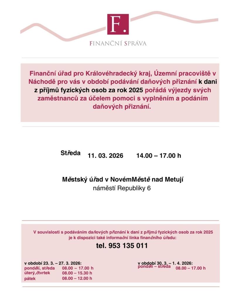 Ve středu 11. března 2026 od 14:00 do 17:00 hodin můžete své daňové přiznání za rok 2025 odevzdat zaměstnancům FÚ na Městském úřadě v Novém Městě nad Metují.