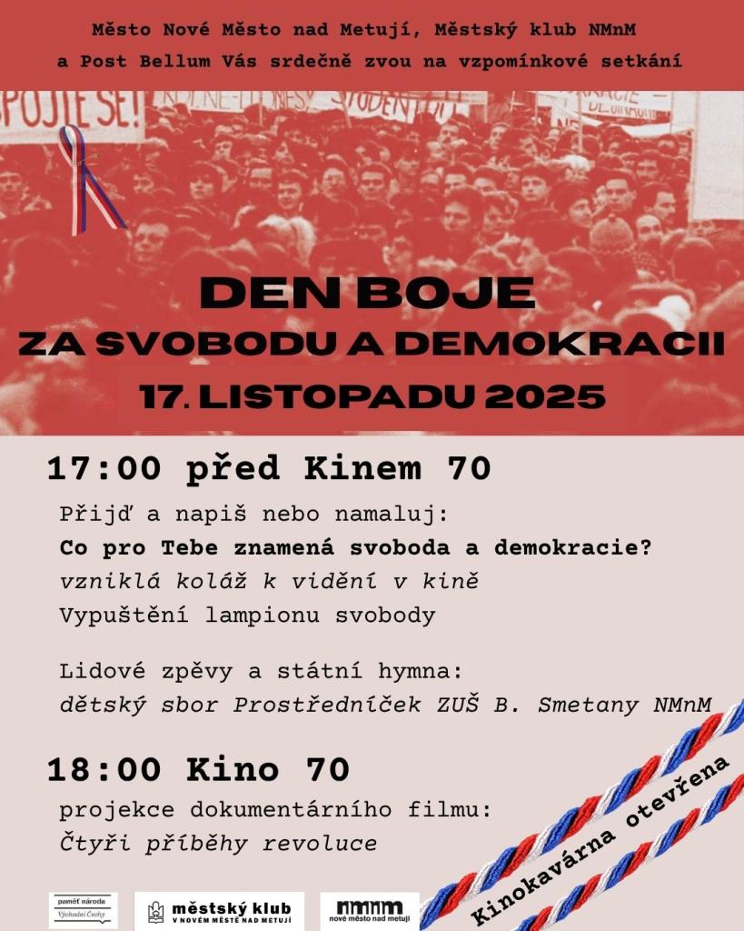Město Nové Město nad Metují, Městský klub NMnM a Post Bellum Vás srdečně zvou na vzpomínkové setkání ke Dni boje za svobodu a demokracii, které se uskuteční 17. listopadu 2025 před Kinem 70.