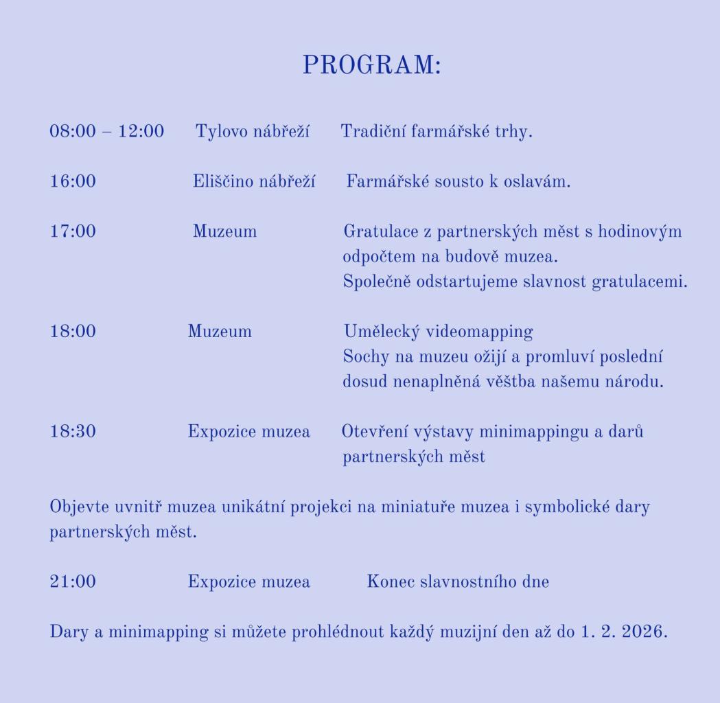 Součástí programu, který přikládáme, budou mimo jiné farmářské trhy či slavnostní otevření výstavy narozeninových darů, které jednotlivá města věnovala jako výraz přátelství, spolupráce a regionální sounáležitosti. Výstava nabídne pestrou škálu exponátů – od uměleckých děl regionálních tvůrců po předměty symbolizující místní tradice a řemesla.