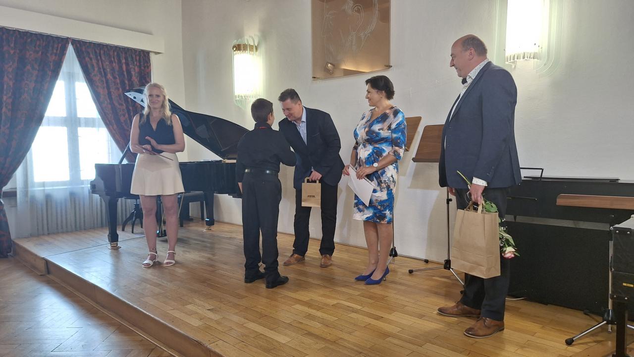 Na závěr byli oceněni žáci Základní umělecké školy Bedřicha Smetany. Klavíristky Anežka Staňková a Veronika Vlčková, všestranná hudebnice Dorotka Macková a violoncellista Václav Večeřa, kteří sklízejí úspěchy nejen na krajských soutěžích.
