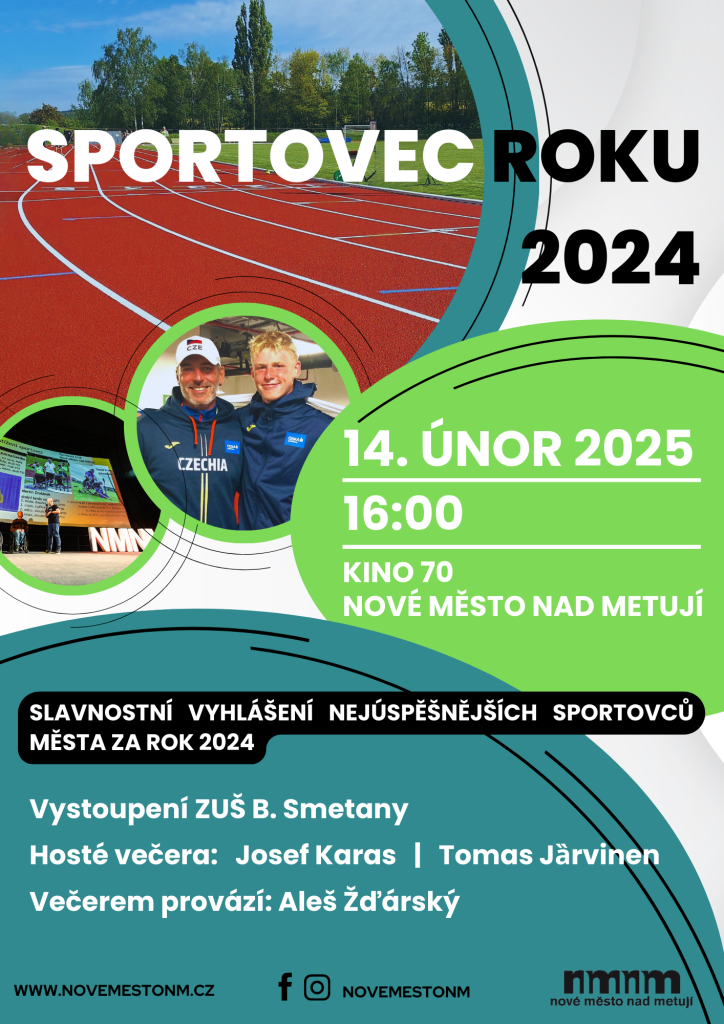 Město Nové Město nad Metují srdečně zve na slavnostní vyhlášení nejúspěšnějších sportovců roku 2024. Slavnostní večer proběhne 14. února 2025 v Kině 70 Nové Město nad Metují.
