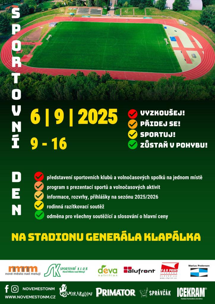 dovolujeme si vás srdečně pozvat na Sportovní den, který se uskuteční v sobotu 6. září 2025 od 9:00 do 16:00 hodin na Stadionu generála Klapálka v Novém Městě nad Metují.