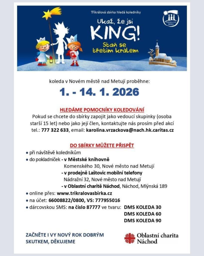 V období od 1. do 14. ledna 2026 proběhne v Novém Městě nad Metují tradiční Tříkrálová sbírka. Tato každoroční charitativní akce je největší sbírkou svého druhu v České republice a jejím cílem je pomoci lidem v nouzi v našem regionu i po celé zemi.