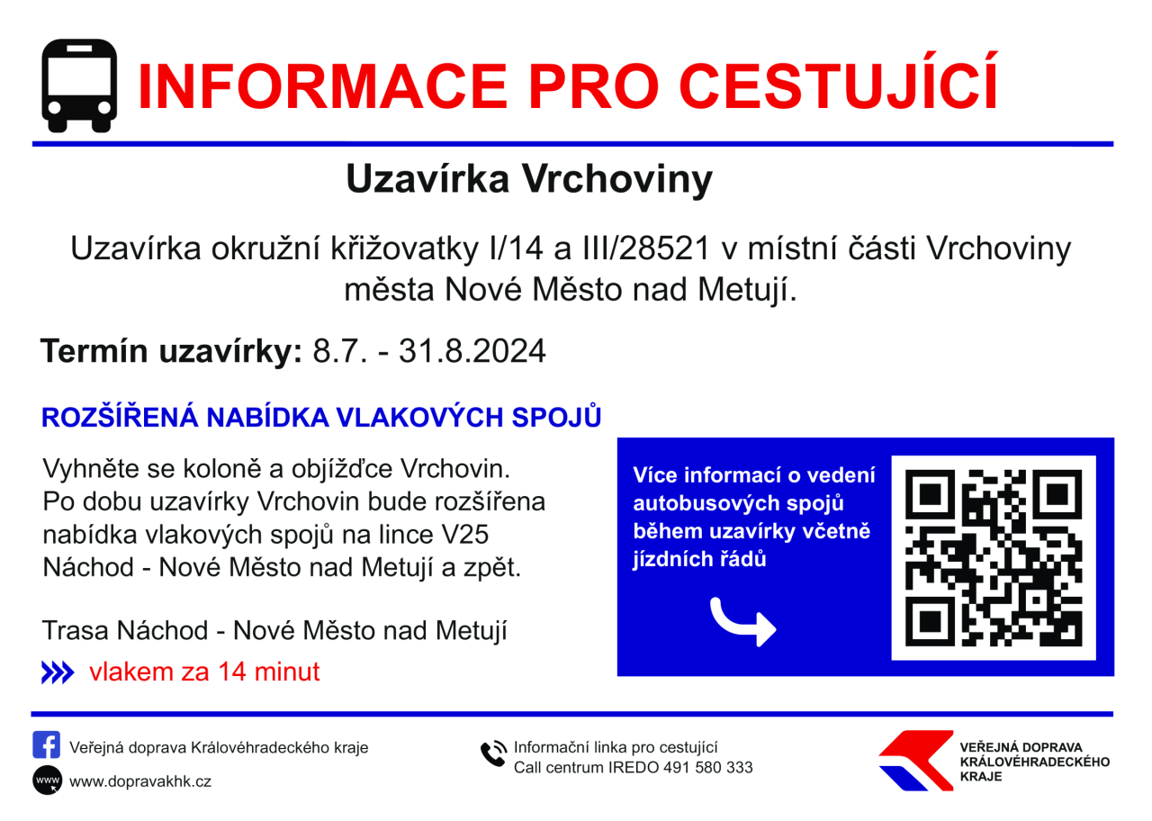 Informujeme občany, že po dobu uzavírky okružní křižovatky ve Vrchovinách bude rozšířena nabídka vlakových spojů na trase Náchod - Nové Město nad Metují.