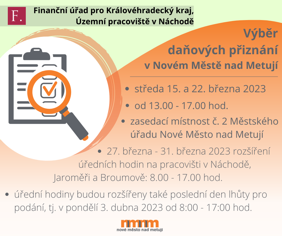 Ještě zítra 22. března 2023 od 13:00 do 17:00 hodin máte možnost odevzdat své daňové přiznání na Městském úřadu v Novém Městě nad Metují.