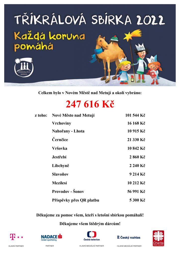 V minulém týdnu byl sečten obsah všech kasiček, do kterých měli možnost občané Nového Města nad Metují a jeho nejbližšího okolí po dobu trvání Tříkrálové sbírky (od 1. do 16. ledna 2022) přispívat. I přesto, že současná situace prakticky znemožnila návštěvy koledníků přímo v domácnostech a většina přispívajících tak musela využít kasiček umístěných na veřejných místech se v letošním roce vybralo úctyhodných 247.616 Kč.
