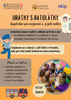 Zveme rodiče s dětmi děti od 0 do 4 let na setkání v rámci projektu Bookstart S knížkou do života.