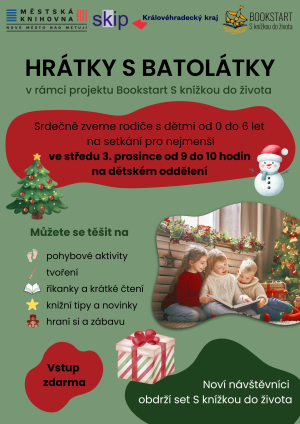 Setkání určené pro rodiče a děti v rámci projektu Bookstart - S knížkou do života. Pohybové aktivity, tvoření, říkanky, krátké čtení, knižní tipy a novinky a další. 3. 12. od 9 do 10 hodin na dětském oddělení knihovny.