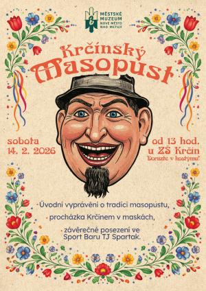 14.02.2026, ve 13:00, u ZŠ Krčín Úvodní vyprávění o tradici masopustu, procházka Krčínem v maskách, závěrečné posezení ve Sport Baru TJ Spartak.