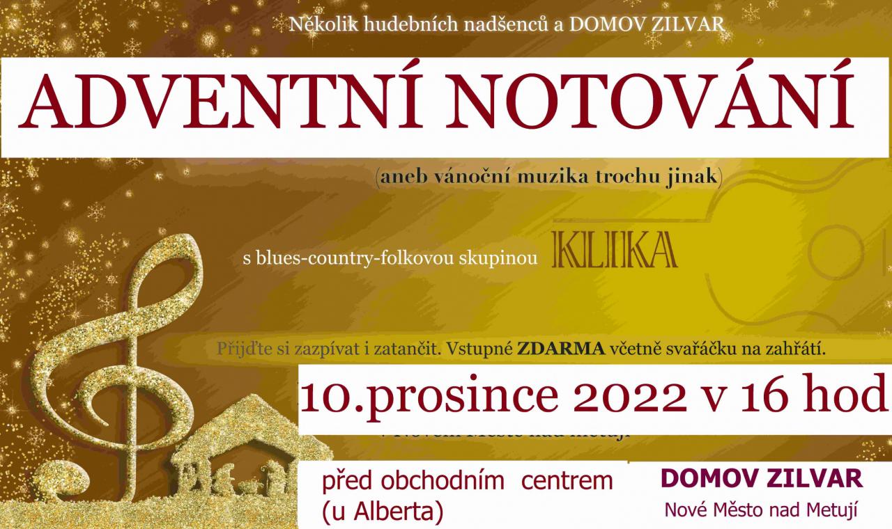 V sobotu 10. prosince 2022 od 16 se koná před obchodním centrem DOMOV ZILVAR (u Alberta) ADVENTNÍ NOTOVÁNÍ,